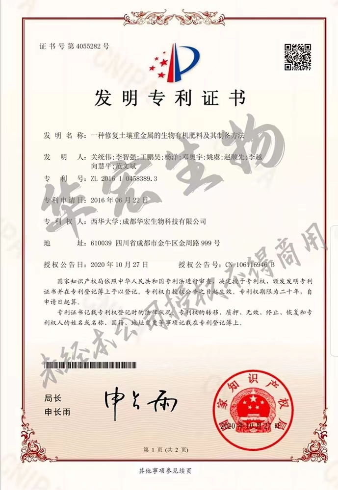 一種修復(fù)土壤重金屬的生物有機肥料及其制備方法專利證書